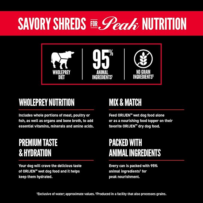 - ORIJEN wet dog food is tailored to help your dog thrive with a high moisture content to keep your canine hydrated