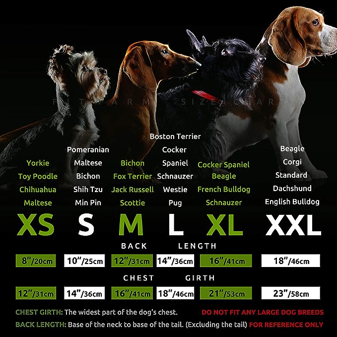 - DO NOT fit any medium or large dog breeds. Please priority follw the chest size. Size Medium, fits 12" back, 16" chest. Recommended for Bichon, Fox Terrier, Jack Russel, Scottie