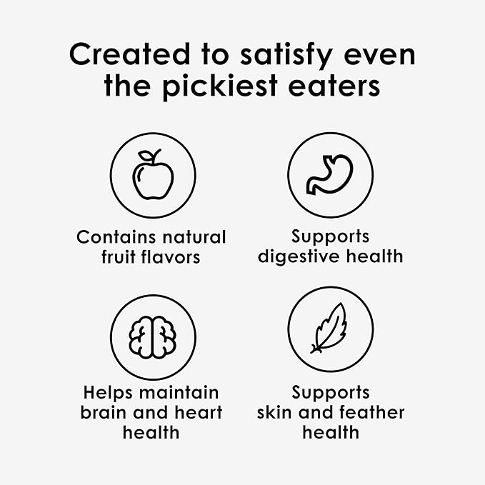 - OPTIMAL ALL-IN-ONE NUTRITION of prebiotics, probiotics, Omega-3, to support digestive, brain, skin and feather health.