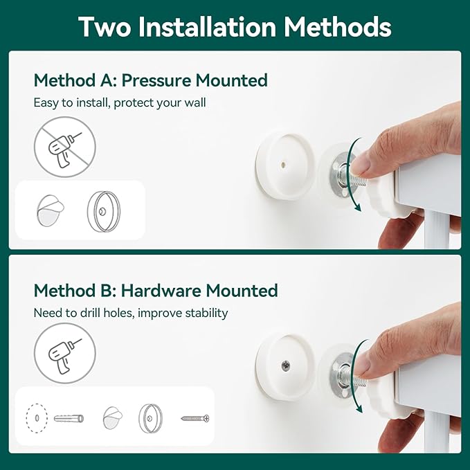 - EASY SET UP: Simple and quick pressure installation, not require additional tools and no holes in the wall. NOTE: Before installation there will be a gap between the gate latch and the frame which is NOT a defect and it is NOT bent. This gap will be eliminated once installed.