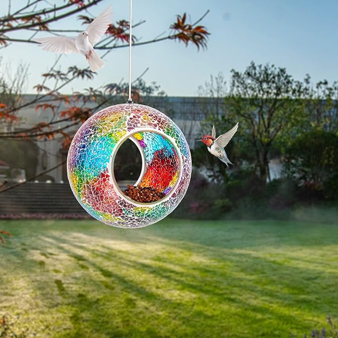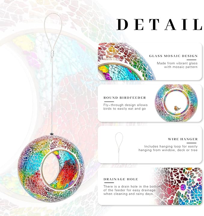 - 【Mosaic Design】This round mosaic bird feeder with a hanging wire so you can easily hang the feeder outside to brighten up your backyard, patio, lawn, deck, or balcony. It catches sunlight as it gently spins and sparkles. Size: 7 x 7 x 3.5 inches