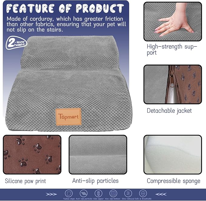 - Safer,Wider&Deeper Steps:Our dog stairs are excellent for those older dogs who are less mobile as they age or for cats with injuries. More wide and deep steps are helpful for reducing the strain that constantly jumping up and down onto lower bed,sofa can have on your pet's joints,and Topmart dog steps will not shake and slip during use. The cover made of corduroy is more frictional than other covers, pets will not slip on the stairs.