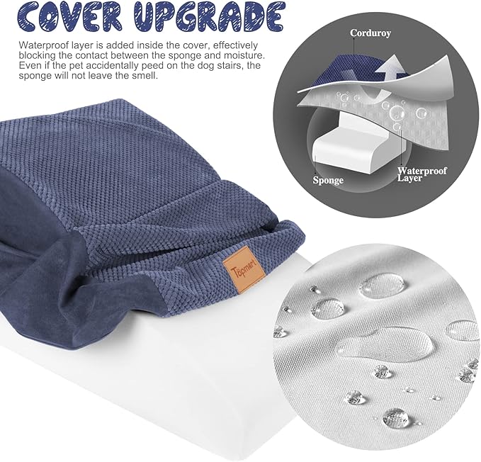 - Upgrade: Compared to the original model, we lengthened each step by 2 inches and each step is larger, increasing the safety of the product while providing a smoother climbing environment for older or leg-injured pets. Cover added waterproof layer to protect the sponge from getting dirty. Even if the pet accidentally pee on the dog ladder, will not leave a mark on the sponge.