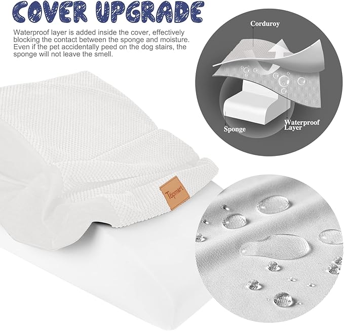- Upgrade: Compared to the original model, we lengthened each step by 2 inches and each step is larger, increasing the safety of the product while providing a smoother climbing environment for older or leg-injured pets. Cover added waterproof layer to protect the sponge from getting dirty. Even if the pet accidentally pee on the dog ladder, will not leave a mark on the sponge.