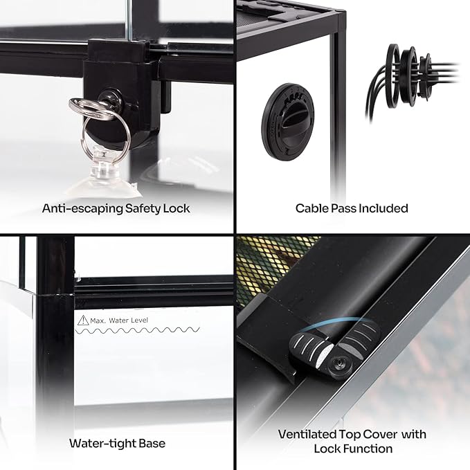 - The front doors can open separately, it’s easier for you to feed, clean, decoration or maintenance. The terrariums feature anti-escaping safety lock to prevent escape.