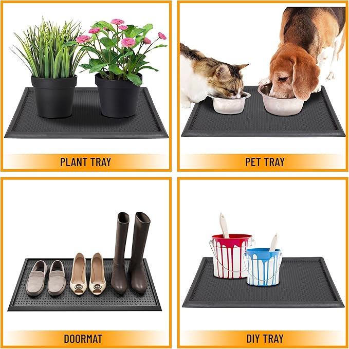 - [RECOMMENDED USE]: This multipurpose tray can be utilized as a doormat, boot tray, mud mat for shoes, potty training pad for your puppy, litter catcher under your litter box, pet feeding mat, and scratcher mat for your kitten. Perfect for indoor or outdoor areas such as the entryway, doorway, patio, garage, mud room, deck, basement, kitchen, sunroom, or porch.