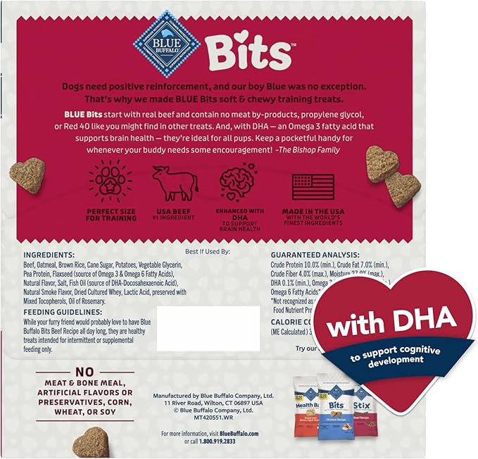 - REAL BEEF FIRST: BLUE Bits dog training treats are made with delicious real beef as the first ingredient making them an ideal reward for your best friend’s best behavior