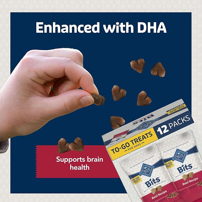 - MEATY TRAINING TREATS: For dogs that love a meaty treat, BLUE Bits are tender, bite-sized morsels that are the perfect size for training; plus with DHA to help support cognitive development, they’re an ideal puppy treat