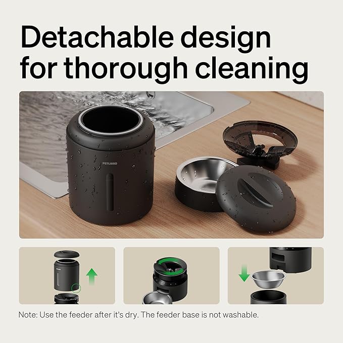 - Freshness in Every Bite: Patent rotor in the tank base and twist-lock lid of the automatic pet feeder prevent pets sneaking into the food dispenser for extra food. Built-in desiccant bag and sealing strip keep food fresh and crunchy. Food-grade stainless steel bowl provides healthy and hygienic feeding, saving your pets from chin acne.