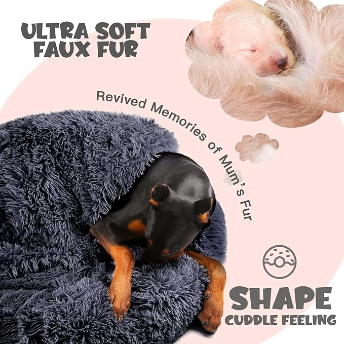 - Calming Dog Bed: Solve pet anxiety and get better sleep and peace of mind. Especially in thunderstorm weather, our pets lack a sense of security and are prone to yelling and anxiety. The plush dog bed in the shape of a donut makes puppies, kittens, and pregnant pets feel embraced, and the blanket adds comfort and alleviates anxiety. It can help your pets stay calm and sleep soundly, even in harsh conditions.