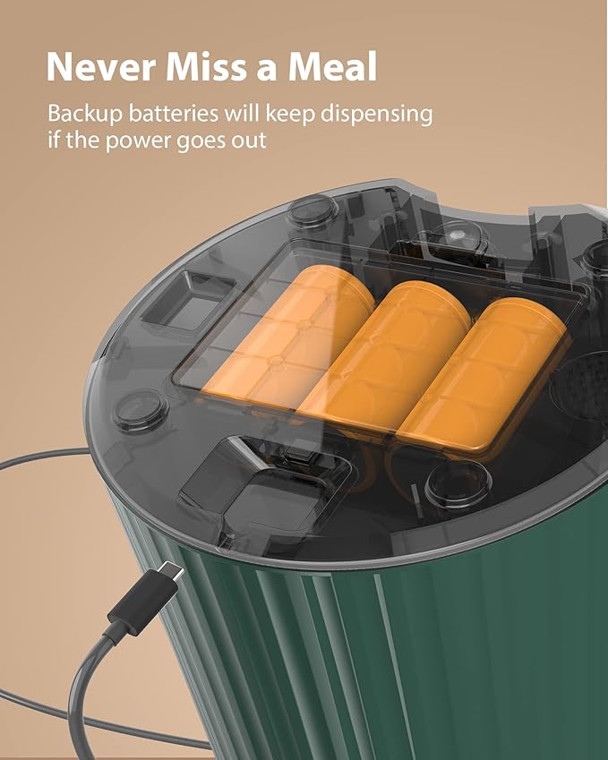 - Dual Power Supply: When you plan to leave your cat for several days, an automatic feeder with battery backup will keep dispensing even if the power goes out and your cat won't starve. If power goes out without batteries inside, the meal settings are memoried when power comes back on.
