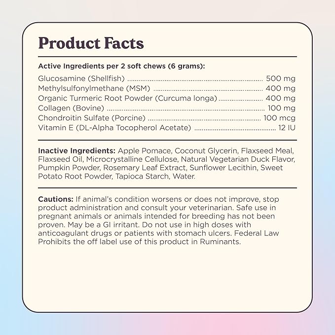 - 500 mg of glucosamine in every 2 chews, designed to support joint comfort and flexibility