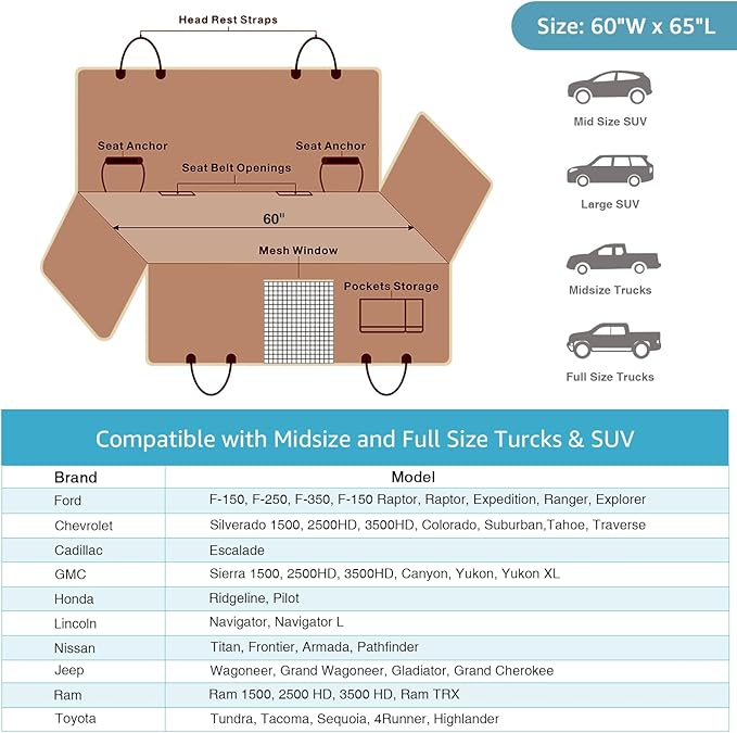 - XL Size Fit for Large and Full Size Pick ups & SUV: The dog car truck hammock style cover is compatible with Ford F-150,F-250,F-350,F-150 Raptor,Raptor,Expedition,Ranger,Explorer,Chevrolet,Silverado 1500, 2500HD, 3500HD,Colorado,Suburban,Designed to accommodate dogs and cats of all sizes, from tiny pups, small, medium,large to giant breeds even you have multiple pets.