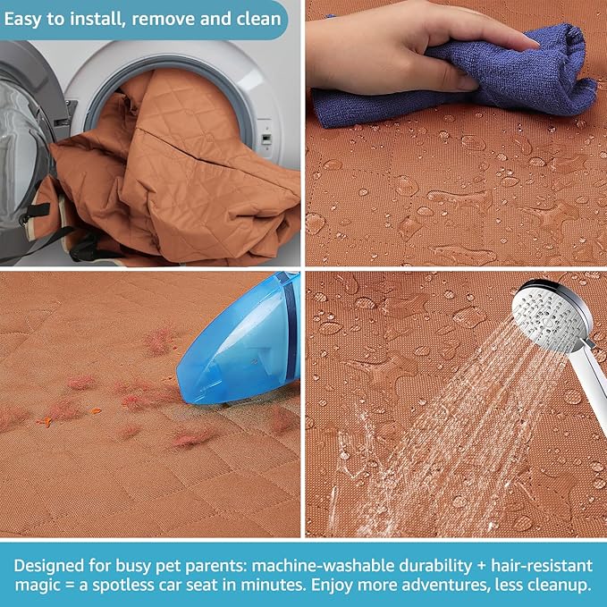 - Easy install, Quickly Remove and Machine Washable: The back seat dog cover for car features a user-friendly installation process that ensures a secure fit for your car interior in moments. Available in multiple colors and designs to match your personal style while providing essential protection. When it's time to clean, wash in machine after muddy adventures or pack up, its seamless removal is just as quick and hassle-free. The ultra-smooth surface and anti-static fabric repel pet hair, while hidden hair-catching grooves trap loose fur. Simply shake off or wipe clean in seconds - no sticky rollers needed! Bye-Bye, Stubborn Pet Hair!