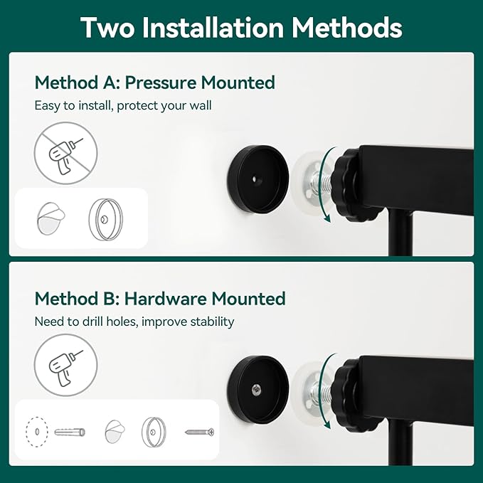 - EASY SET UP: Simple and quick pressure installation, not require additional tools and no holes in the wall. NOTE: Before installation there will be a gap between the gate latch and the frame which is NOT a defect and it is NOT bent. This gap will be eliminated once installed.