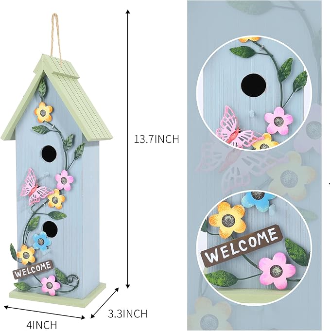 - 2 Tiers Birdhouse: The outdoor hanging bird houses provide a warm home for birds against the cold wind, rain, snow and predators allows bird friends to fly with peace of mind. Your little bird and his friends will have a wonderful time