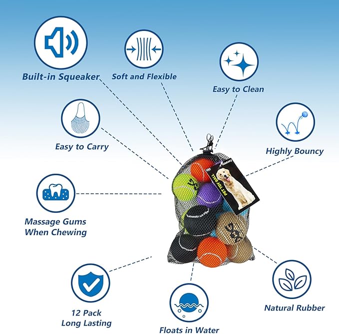 Squeaky Tennis Balls for Dogs - 12 Pack 2.0'' Durable Non-Toxic Outdoor Dog Toys Balls with Mesh Bag, SGS Certified, Colorful Fetch Toys,Small Breeds