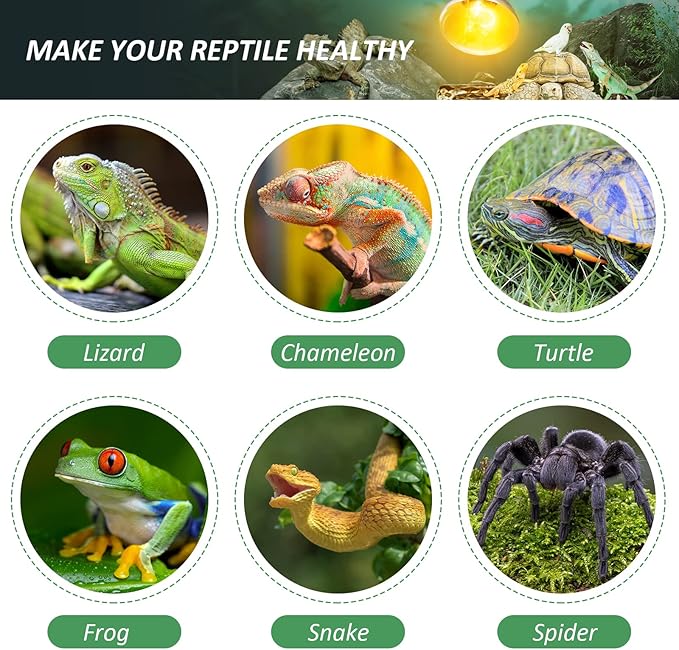 - KEEP YOUR REPTLES/PETS HEALTHY - The reptile bulb simulates the sun's rays to make your baby more comfortable. It compositions promote vitamin D3 synthesis to maintain healthy skin and bones for reptiles, fully absorb calcium; Infra-Red (Heat): provides the warmth which cold-blooded animals are used to in nature.