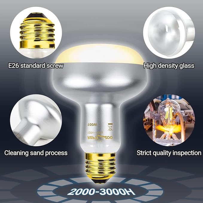 - 【Long Service Life】Adopt updated vacuum aluminizing process technology, the efficiency of the heat lamp bulb increase by 35% and save more energy. Good quality results from upgraded process and the reptile heat lamp can be used over 2000 hours, max 3000 hours.