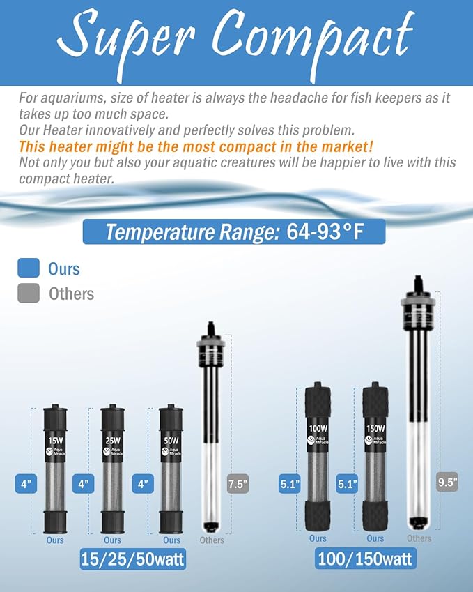- SUPER MINI SIZE – This aquarium heater is SUPER SHORT in length – might be the shortest heater in the market. It is only a bit more than HALF of the length comparing with the traditional fish heaters! The innovative super short length perfectly solves the headache of the fish keepers on the traditional aquarium heaters! Takes up less space, easy to hide, but in full power! Temperature range is 64-93F.