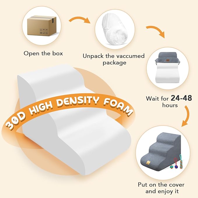 - 【30D HIGH DENSITY FOAM】The pet stairs is made of 30D high density, which owns the ability of rapid rebound. It can hold up to 60 lbs. Highly breathable foam base has no odor. Never worry about deformation after pets run. The high-quality coral fleece surface improves the good friction, and the pet will not slip when moving on it.