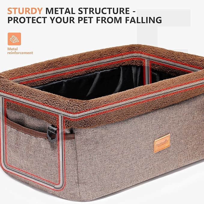 - Keep Your Pet Safe: Internal collapsible metal frame can offer pets sturdy support and the thick fluffy cushion will offer your furry friend cozy trip. And the clip-on safety leash can fix your dogs in this pet car seat.