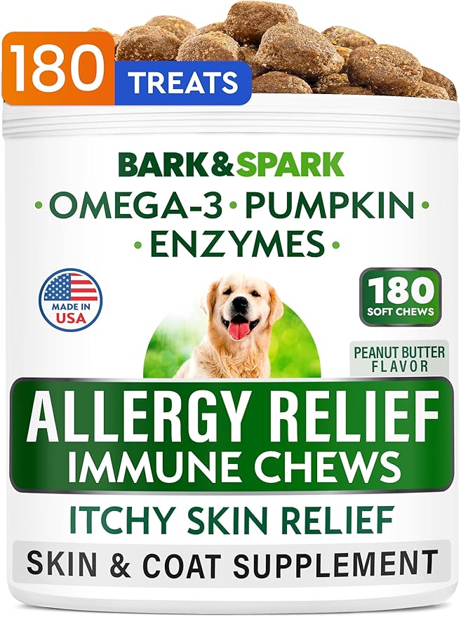 BARK&SPARK Dog Allergy Relief Chews (180 Ct) - Anti-Itch Skin & Coat Supplement - Omega 3 Fish Oil - Itchy Skin Relief Treatment Pills - Itching&Paw Licking - Dry Skin&Hot Spots -Peanut Immune Treats