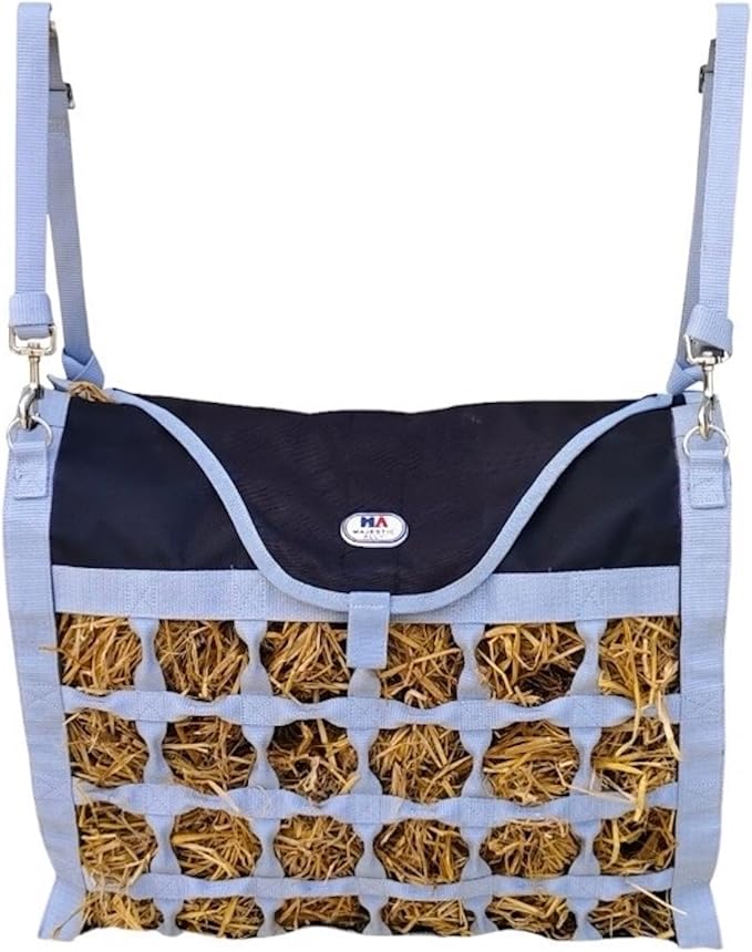 Majestic Ally Animal Health Hay Bag for Horses, 2.5" Holes, Top Load, Travel Feeder, Reduces Waste, 1 Year Warranty, Multiple Colors (Gray-Black)