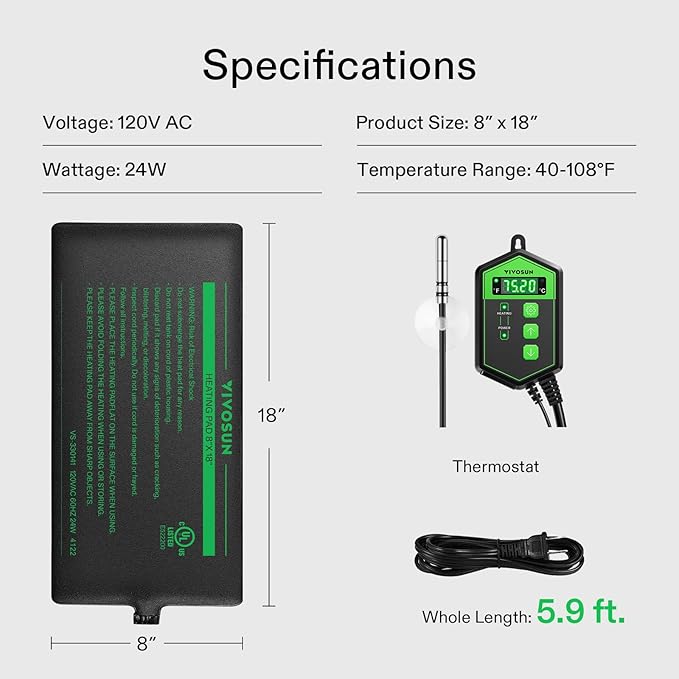 - Intelligent Constant Temperature: This reptile heat pad can get well about 104℉(40℃) ; Use this Digital Thermostat to monitor the temperature of your terrarium; Regulates and maintains your preferred temperature within a control range of 40–108 ºF (Temperature display range is 32 -210°F)