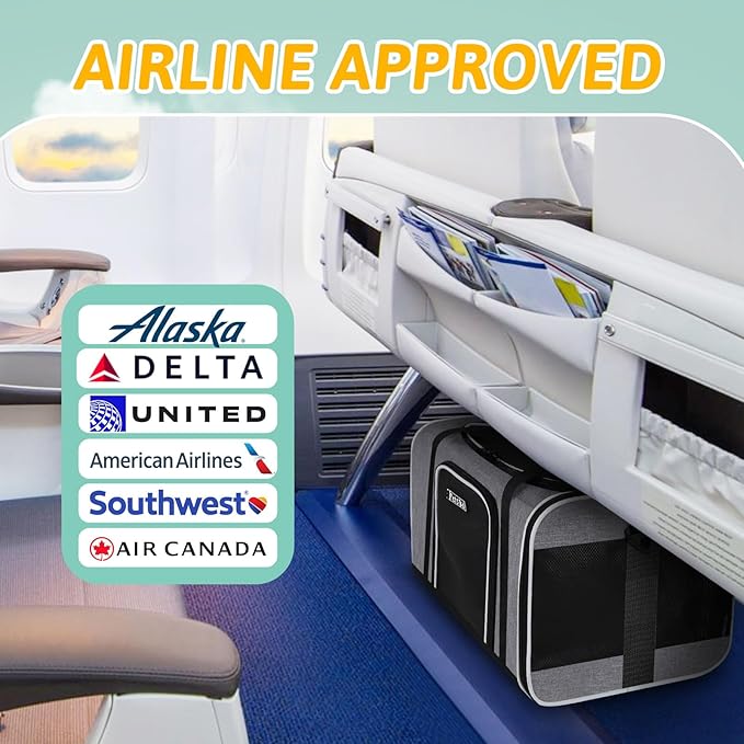- 【AIRLINE APPROVED CARRIER 】Unfolded size:17"L×11"W×9.5"H, Petskd pet carrier is airline approved and can be placed under the seat in the cabin, it is mainly designed for ①Alaska Airlines:17x11x9.5", but also in compliance with ②Southwest Airlines:18.5x13.5x9.5" ③Delta Airlines:18x11x11" ④United Airlines:18x11x11" ⑤American airlines:18x11x11" ⑥Air Canada:21.5x15.5x10.5". We recommend you buy this carrier when you fly with the above-mentioned airlines.