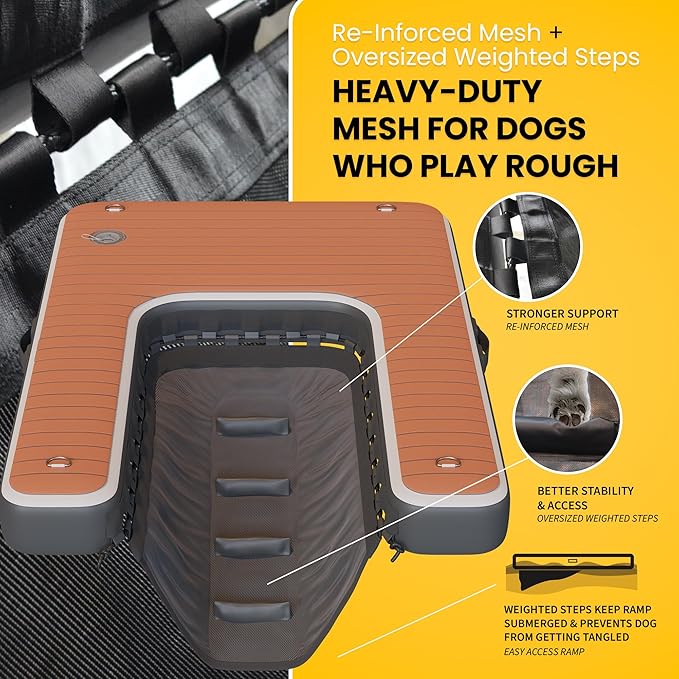 - Safe Water Access: The Dog-DOK ramp provides a safe and convenient way for your dog to access the water. It has an easy-access submerged ramp, oversized steps, and heavy-duty mesh that's weighted to keep it submerged.