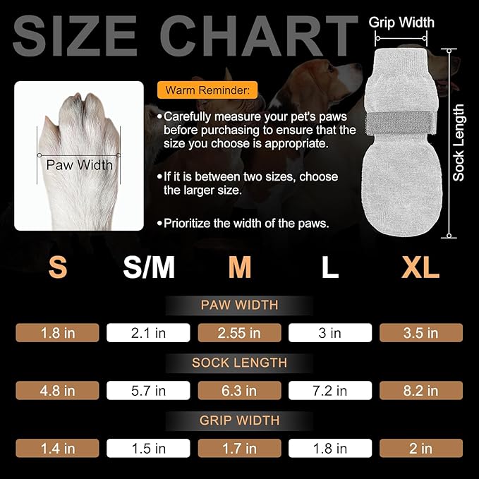 - Size Large: Length7.2" Paw width3" Grip width 1.8". Please measure your pet before purchase, if your size is between the two sizes, it's better to choose the smaller size. Because our pet paw protector socks are fabrics with elasticity. (Measurement method: let your dog step on a piece of paper and draw the outline of the paw. Measure the width of the claw and choose size. Note: make sure your dog is on paper instead of putting your paws on the paper at will.)