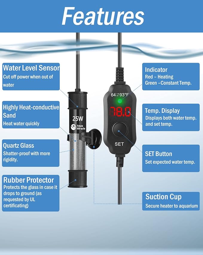 AquaMiracle Adjustable 25W Aquarium Heater Submersible Fish Tank Heater Super Short Aquarium Heater with LED Digital Display Thermostat, for Tanks 3-5 Gallons