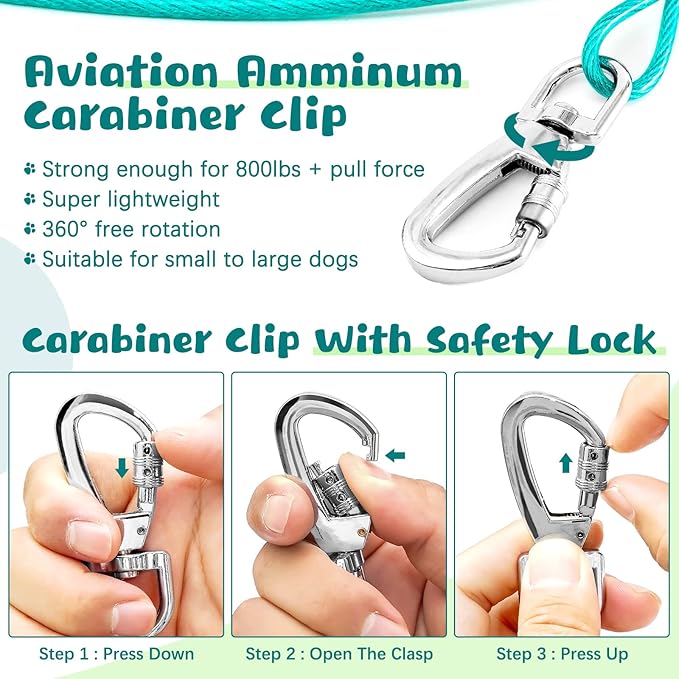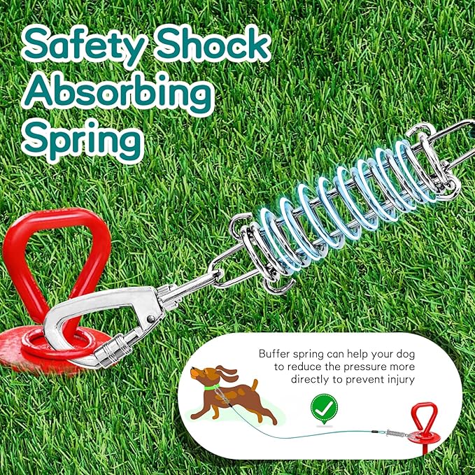 - Durable Superior Clip: The dog leads for outside has 360°free-rotating clip, which is lightweight, durable and rust-proof. Both ends will be easily connected to the ground pillar or screw pile. The spiral ring lock is used to ensure pet’s outdoor safety.
