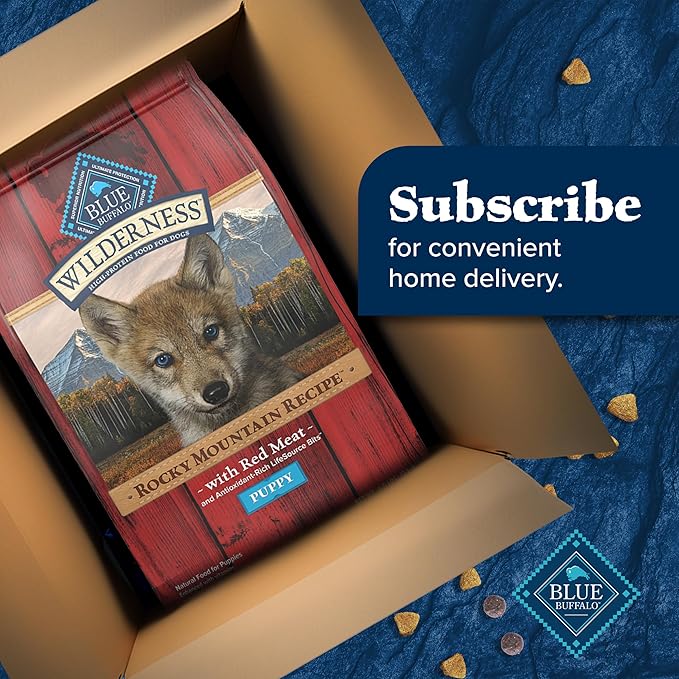 - Contains: One (1) 28-lb bag of BLUE Wilderness High-Protein Puppy Dry Dog Food, Rocky Mountain Red Meat & Grain Recipe