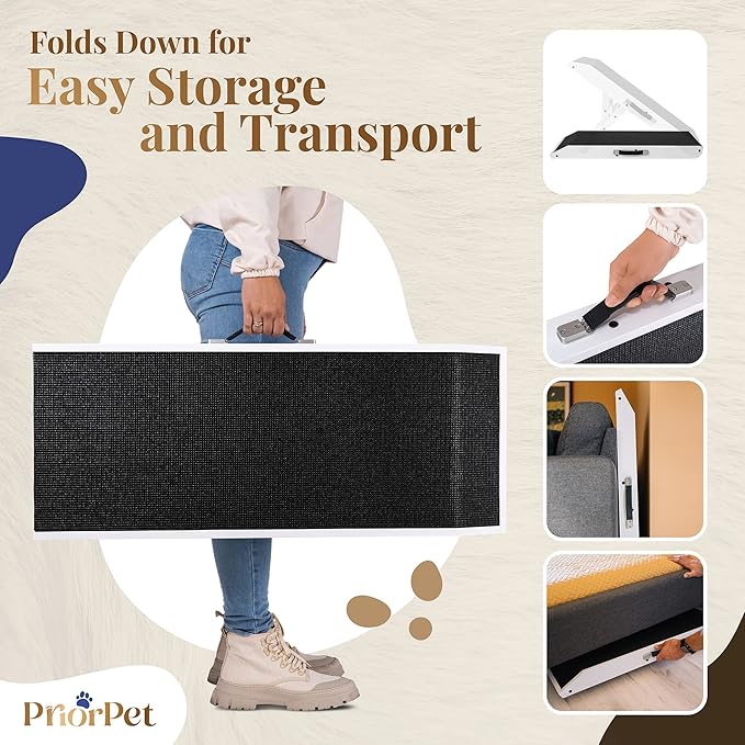 - ADJUSTABLE HEIGHT: Heights of 20in, 18in, 16in, 13in, and 7in. Can be adapted to couches, beds, or cars. Ramp folds flat to just 3in for easy storage and transport.