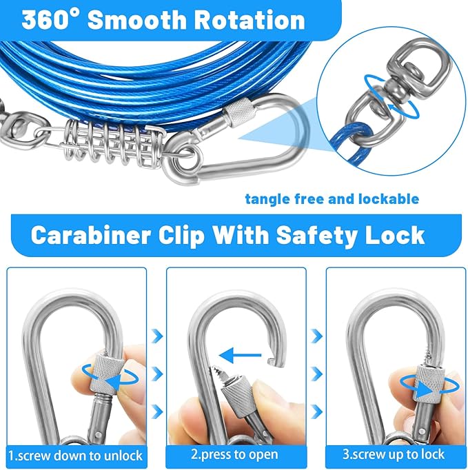 - THE NEWTEST CLIP: The rotating clip can rotate 360 °, and the clip is fixed with a ring at the bottom,so that the dog leash will not fall off the hook easily. Provide more space for dogs to move without entanglement. The screw on the swivel hook can lock it to prevent your pet from escaping from the cable and running to dangerous places. pet from breaking free of the cable and running into harm's way.
