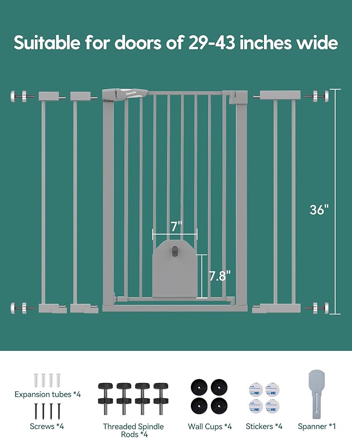 - EXTRA TALL BABY GATE WITH CAT DOOR:This safety gate for stairs and doorways features a taller 36" height and adjustable 29" to 43" width to keep larger toddlers, puppies, or dogs from climbing over or entering unwanted areas.