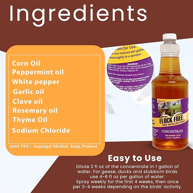 - ECONOMICAL: Simply dilute with water and makes up to 16 gallons of ready to use product! See the easy to follow instructional video on how to prepare the bird repellant spray. Spray to keep birds from nesting.