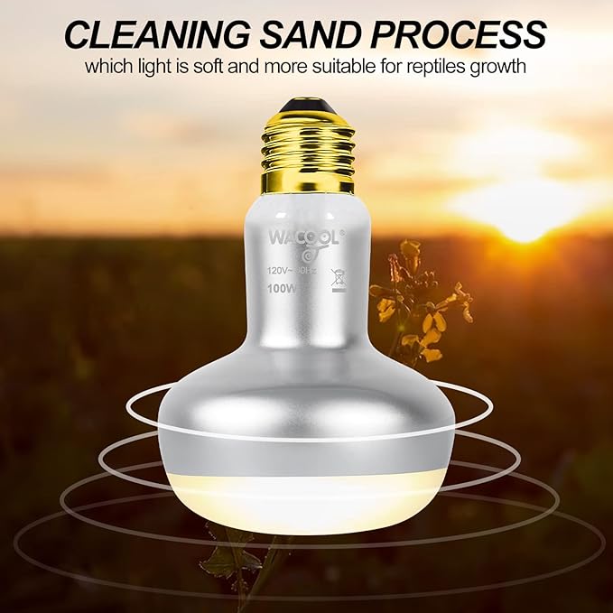 - 【Simulate natural sunlight】Wacool 100W reptile heat lamp simulates natural sunlight and provides long-wave UVA ultraviolet rays, which helps to enhance the appetite, reproduction and natural behavior of reptiles, while maintaining their biological clock, allowing your pet to feel a closer to natural environment.