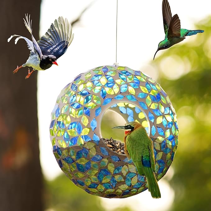 - 【Attracts a Variety of Birds】 Fill with seeds, nuts, or nectar to invite finches, blue jays, and even hummingbirds! The mosaic reflections create a mini bird sanctuary right in your backyard.
