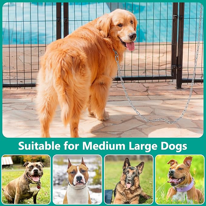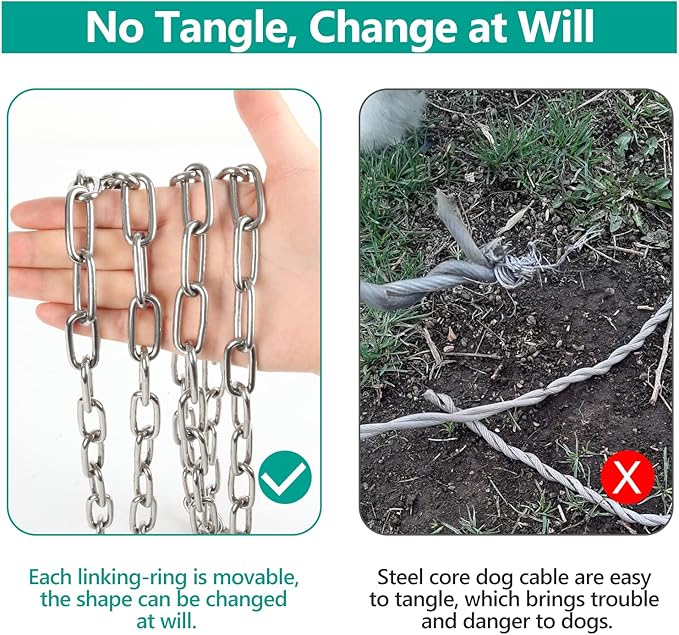 - 【Durable and Chew Proof】This metal tie-out cable is made of metal, and the chain and clasp can withstand the dog's chewing and dragging, without fear that the dog's teeth will penetrate it. The zinc coating on the surface protects the chain dog leash from rain and soil erosion and extends its service life.