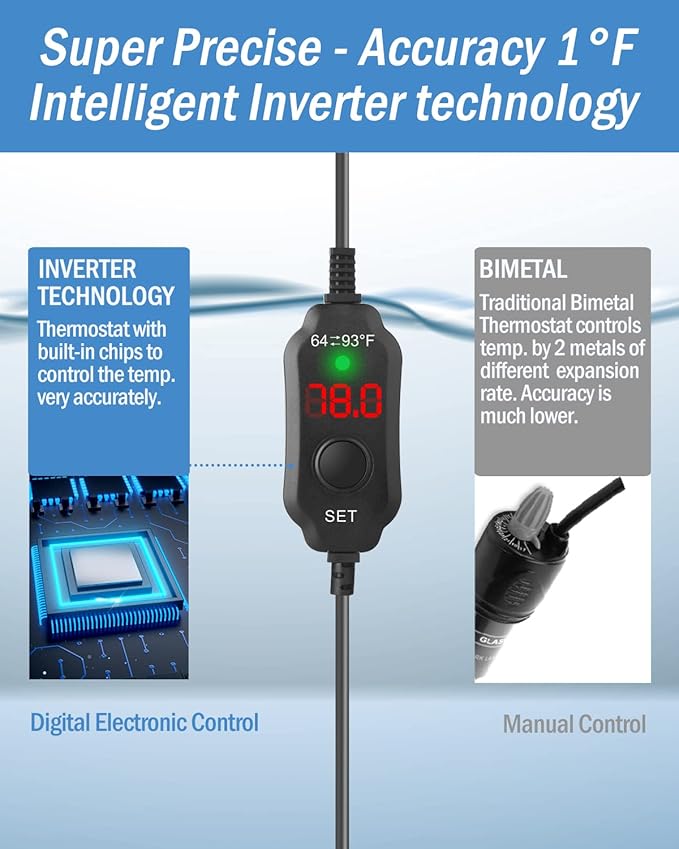 - ACCURATE TEMPERATURE – Thanks to the intelligent inverter technology, with the in-built chips the thermostat keeps the heater at a constant temperature at an accuracy of 1F, much more accurate than the traditional knob-controlled fish heaters. The thermostat shows 2 readings – the current temperature and the set temperature – very easy to operate.