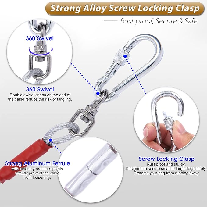 - Heavy Duty Durable Clip: This outside dog leads&chains with 360° free rotation sturdy clasp, lightweight, durable and rust-proof. The ends of the dog tie out cable will be easily attached to a spiral ground stake, tree trunk or fence. The twist lock does not tangle the cable and is used to keep pets safe outdoors.