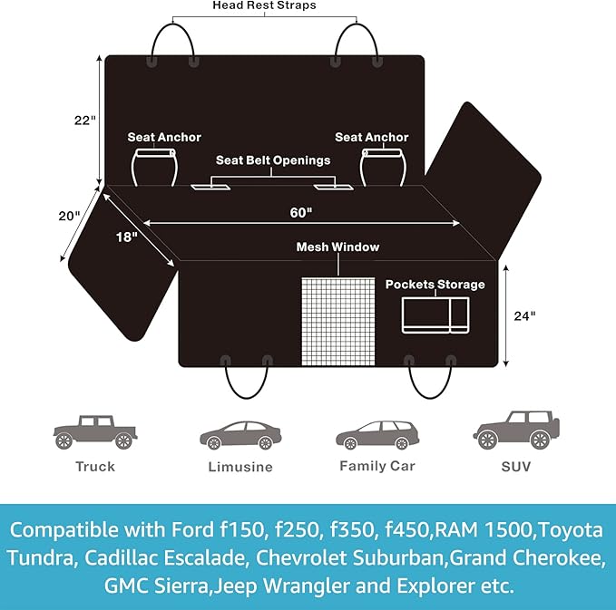 - 60"W x 65"L Dog Car Hammock: Protect from your fur baby’s shedding, sharp nails, and muddy coat. Compatible with Ford f150, f250, f450,RAM 1500,Toyota Tundra, Cadillac Escalade, Chevrolet Suburban, Grand Cherokee, GMC Sierra, Explorer and most full size pickup. You can choose the truck size for Model Y also if you like larger pet seat cover for standard cars.