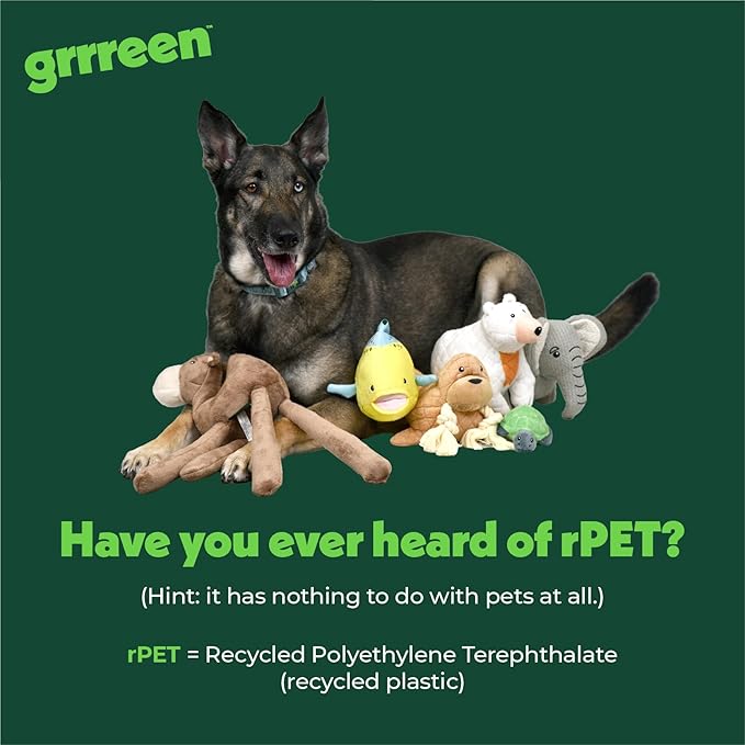 - Cute with a Cause: Adorable meets eco-friendly! Grrreen toys are not only crafted from 100% recycled plastic, but they’re also designed to turn heads. With their loveable looks and planet-saving purpose, these toys make the perfect fun and fashionable companion for your dog.