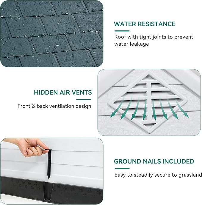 - Weatherproof Structure: Sealed protective design, 2.8 in high base along with slanted roof harmonize to resist dirt, rain, snow, and other weather elements; Our outdoor dog house also has 2 ground nails to ensure stability during heavy winds.