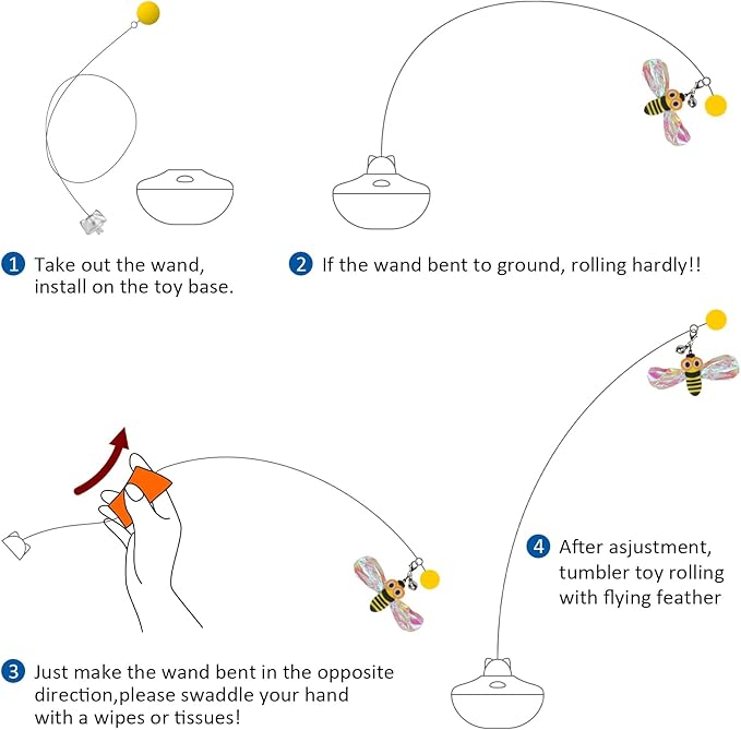 - 4. DIY tails if your kitty bored about original tails. ***If the wand bent to ground, Just make the wand bent in the opposite direction, please swaddle your hand with a wipes or tissues! ***Please add lighter tails, heavily tails will make the wand roll hardly