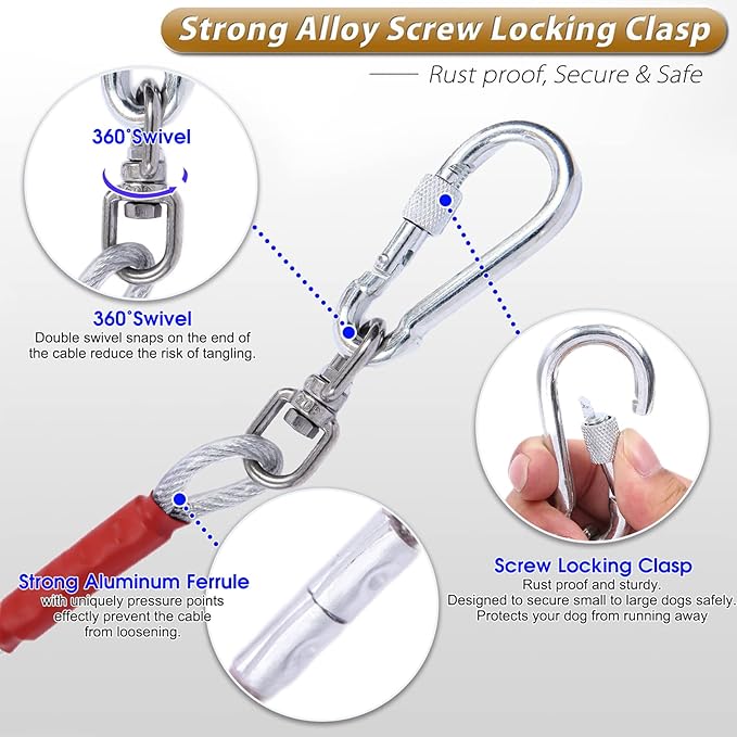 - Heavy Duty Durable Clip: This outside dog leads&chains with 360° free rotation sturdy clasp, lightweight, durable and rust-proof. The ends of the dog tie out cable will be easily attached to a spiral ground stake, tree trunk or fence. The twist lock does not tangle the cable and is used to keep pets safe outdoors.