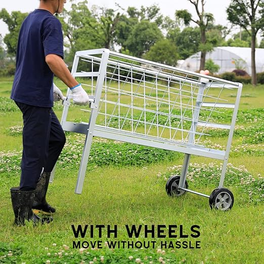 - Mobile Livestock Feeder with 8-Inch Solid Wheels: Move feed effortlessly using the dual handles—no front-end loader required. The heavy-duty wheels allow one-person operation to rotate feeding zones, preventing pasture damage from cattle, sheep, or goats.